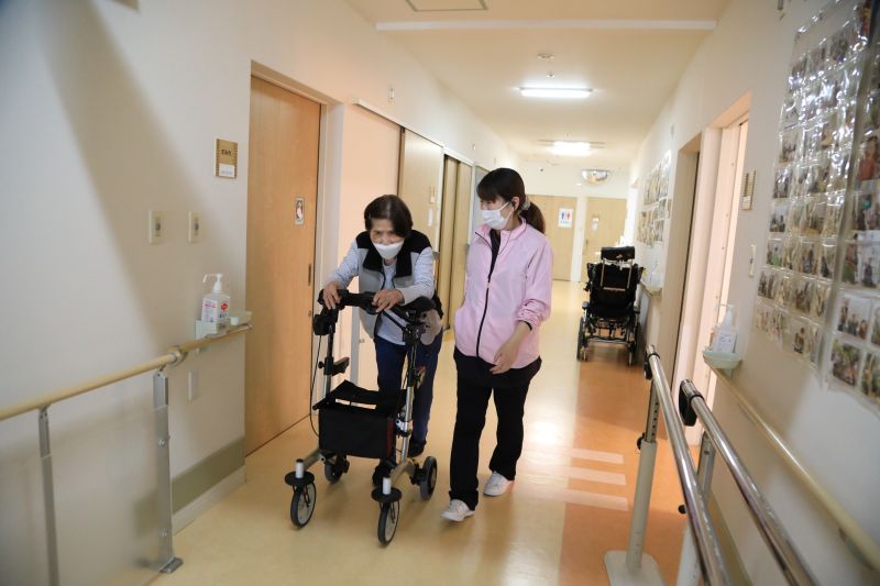 H様は病気の進行もあり、誤嚥性肺炎のために経鼻経管栄養となられたことや寝たきりとなり、ご自宅での生活が難しい状態となってしまわれたため、たでいけ至福の園へ入居されました。そんなH様ですが、入居当初は血圧が安定せず、横になって過ごす時間も多かったため、なかなかリハビリが進まない事もありました。多職種間でも連携を図りながら状態に合わせてリハビリを継続したことや、意欲的なH様の頑張りもあり、現在は3食お口からお食事をとられ、見守りの下での歩行補助具を使用した歩行も可能な状態まで身体機能の改善がみられています。