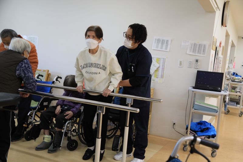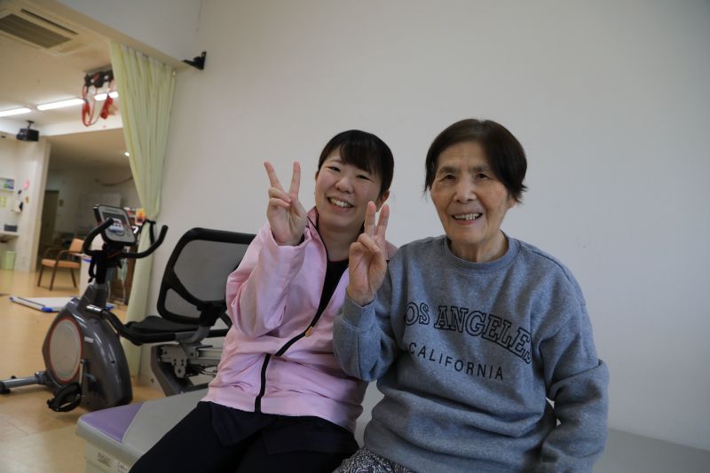 デイサービスの中では、実際の日常生活場面での歩行補助具を使用した状態での歩行、トイレ動作の評価などを実施しました。また個別の身体機能訓練や評価、集団リハビリにおいても、日中の様子を把握しているリハビリスタッフの目線から直接情報を知れる環境はとてもありがたいと感じています。