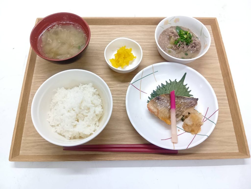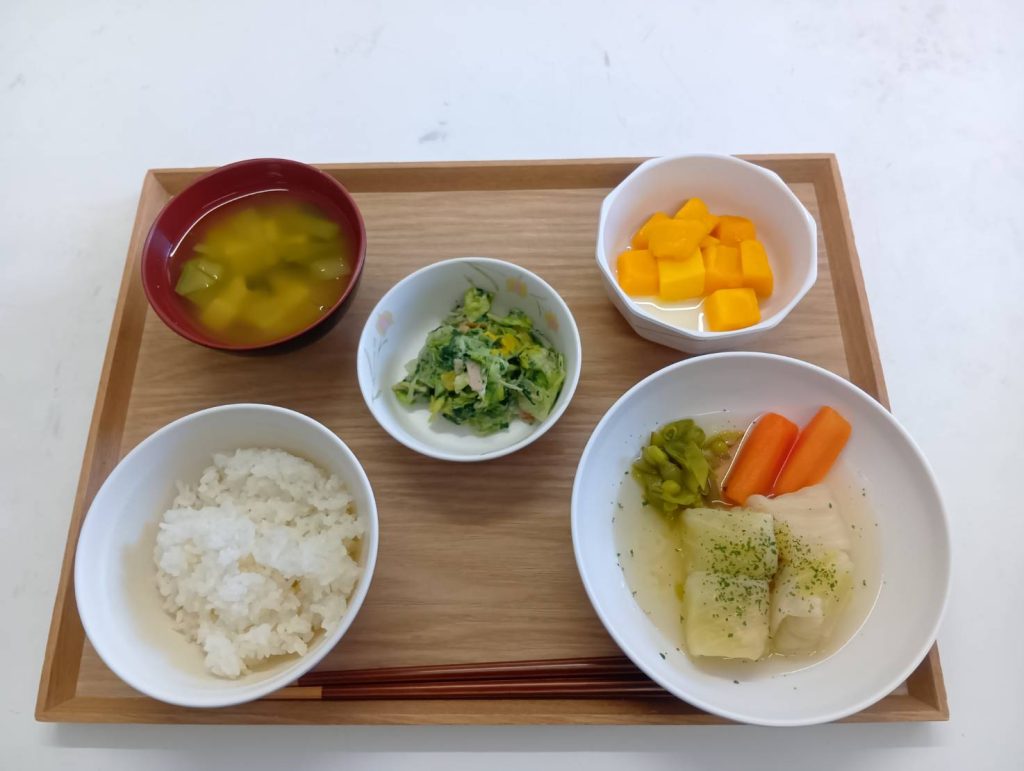 1/12 本日のメニュー 2026年1月14日(水) 朝食 ごはん 大豆と根菜の煮物 みそ汁 たいみそ 牛乳 昼食 ごはん 和風ロールキャベツ シーザーサラダ マンゴー みそ汁 おやつ ぜんざい 夕食 ごはん 魚の照り焼き 茄子田楽 お漬物 白菜とえびのスープ ← トップページに戻る