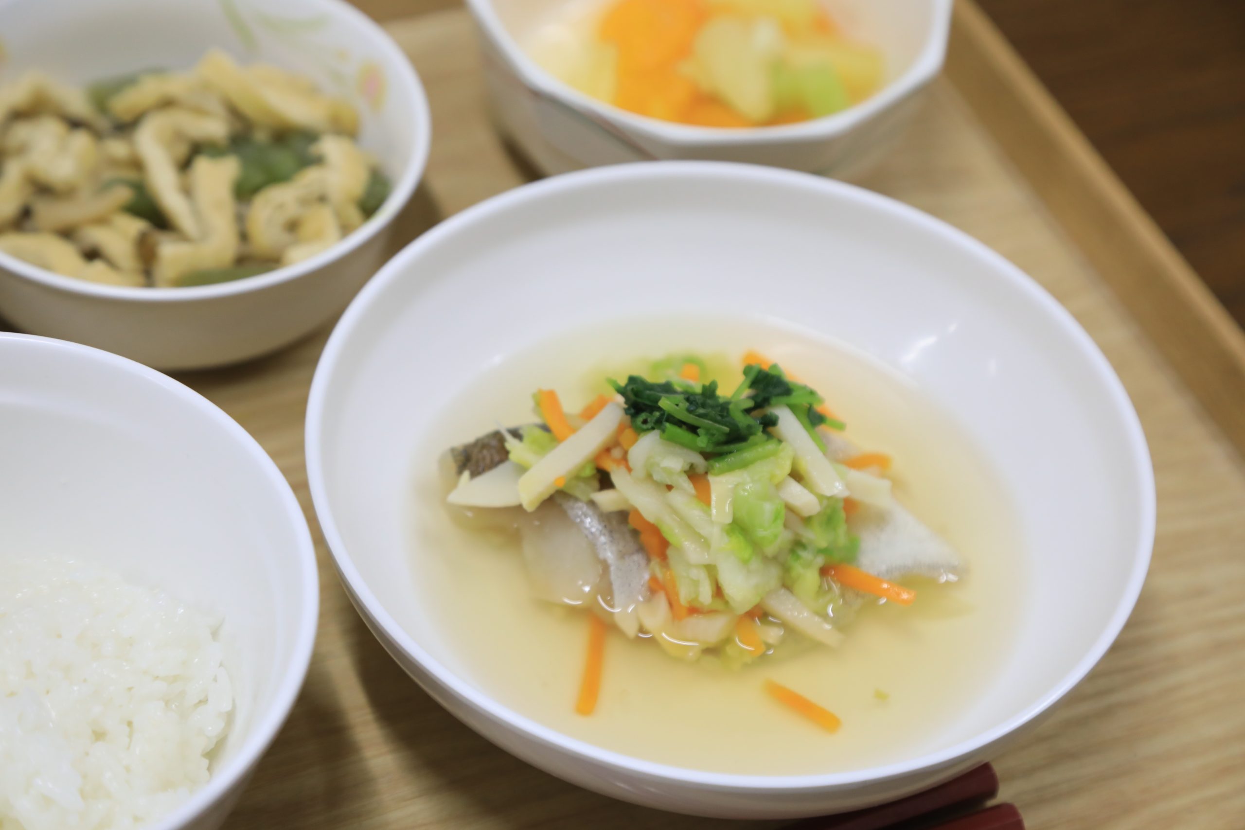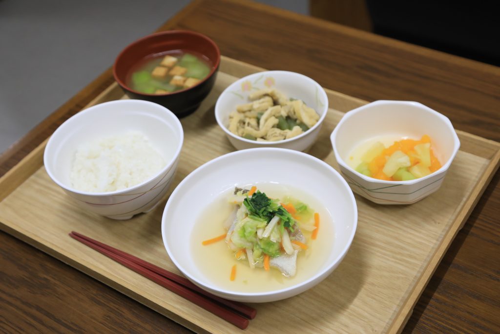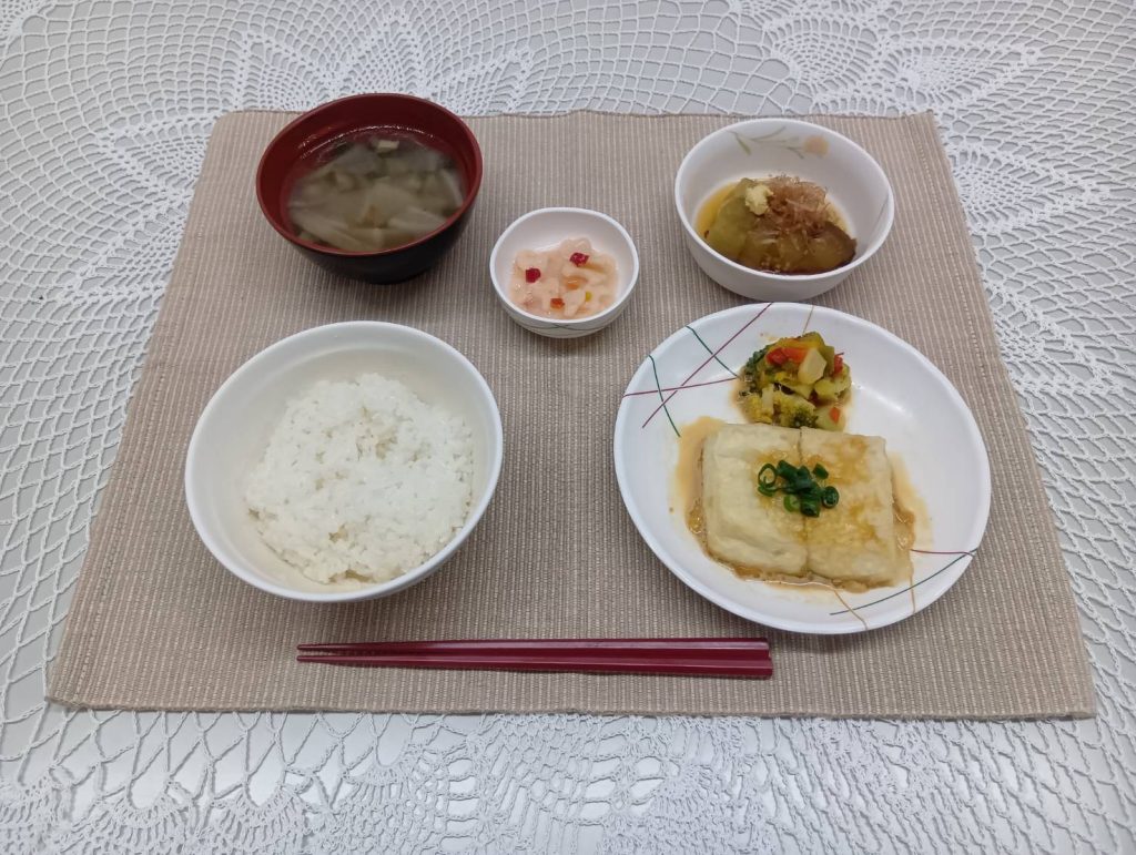 1/21 本日のメニュー 2026年1月23日(金) 朝食 ロールパン&マーブル食パン オムレツ コンソメスープ 牛乳 昼食 ごはん 魚のさらさ蒸し ふきの信田煮 フルーツポンチ みそ汁 夕食 ごはん 甘辛豆腐ステーキ 焼きナス れんこんマリネ のっぺい汁 ← トップページに戻る