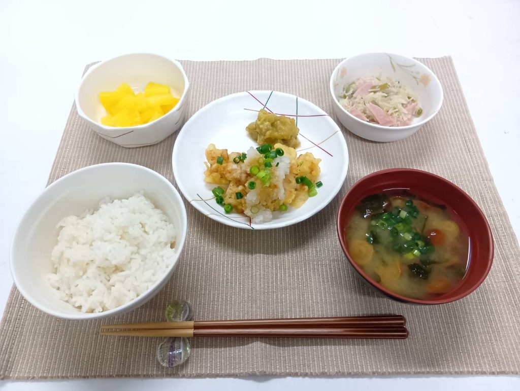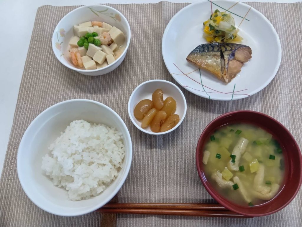 10/15 本日のメニュー 2025年10月16日(木) 朝食 あんぱん 目玉焼き コンソメスープ 牛乳 昼食 ごはん 魚の照り焼き 高野豆腐のくず煮 白花豆 みそ汁 夕食 ごはん とり天おろしのせ ビーフン炒め フルーツ 赤だし汁 ← トップページに戻る