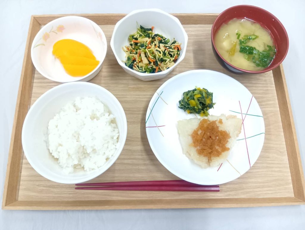 10/31 本日のメニュー 2025年11月4日(火) 朝食 ごはん 里芋の煮物 みそ汁 ふりかけ 牛乳 昼食 ごはん 魚の玉ねぎソースかけ 小松菜のからし和え 黄桃 みそ汁 夕食 ごはん 和風ロールキャベツ アスパラの炒め物 やさい豆 鶏汁 ← トップページに戻る