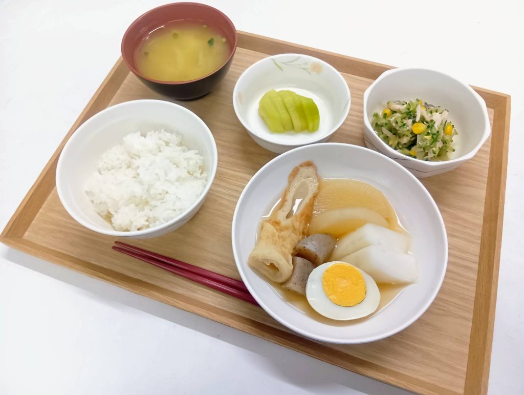 11/28 本日のメニュー 2025年12月1日(月) 朝食 ごはん しらたきの炒め煮 みそ汁 ふりかけ 牛乳 昼食 ごはん シイラのごま醤油焼き かぼちゃの小倉煮 お漬物 わかめスープ 夕食 ごはん おでん きゅうりと鶏の中華和え キウイ みそ汁 ← トップページに戻る
