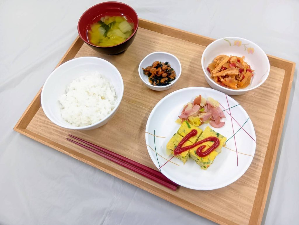 12/19 本日のメニュー 2025年12月22日(月) 朝食 ごはん 厚揚げの煮物 みそ汁 ふりかけ 牛乳 昼食 ごはん 照り焼きチキン ごぼうサラダ パイン コンソメスープ 夕食 ごはん スパニッシュオムレツ セロリのきんぴら 切昆布大豆 みそ汁 ← トップページに戻る