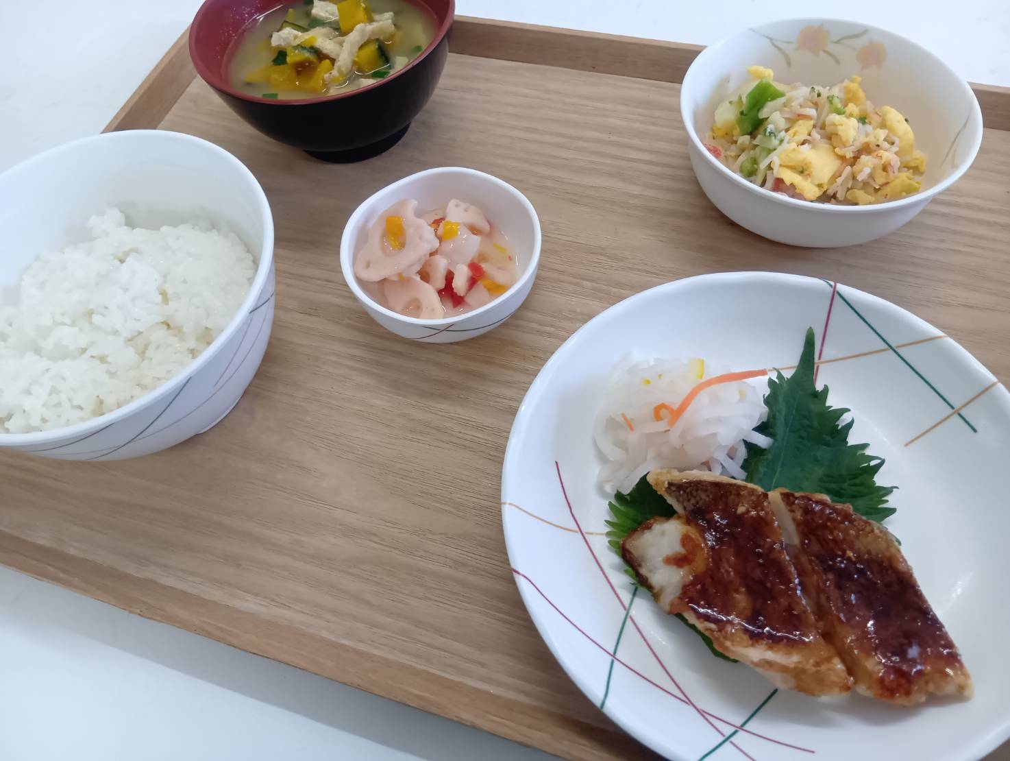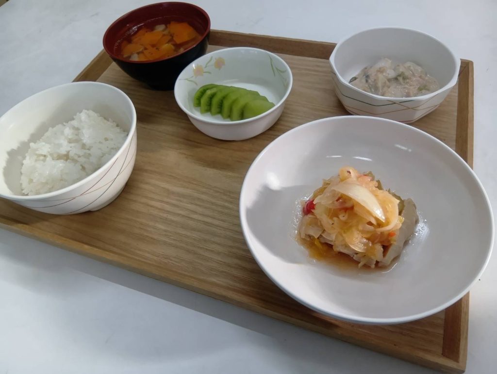 2/1 本日のメニュー 2026年2月2日(月) 朝食 ロールパン ポテトと豚肉のトマト煮 中華スープ 牛乳 昼食 ごはん 魚の蒲焼き ブロッコリーと玉子の炒め物 れんこんマリネ みそ汁 夕食 ごはん 蒸し鶏マリネ 里芋サラダ キウイ カリフラワーのスープ ← トップページに戻る