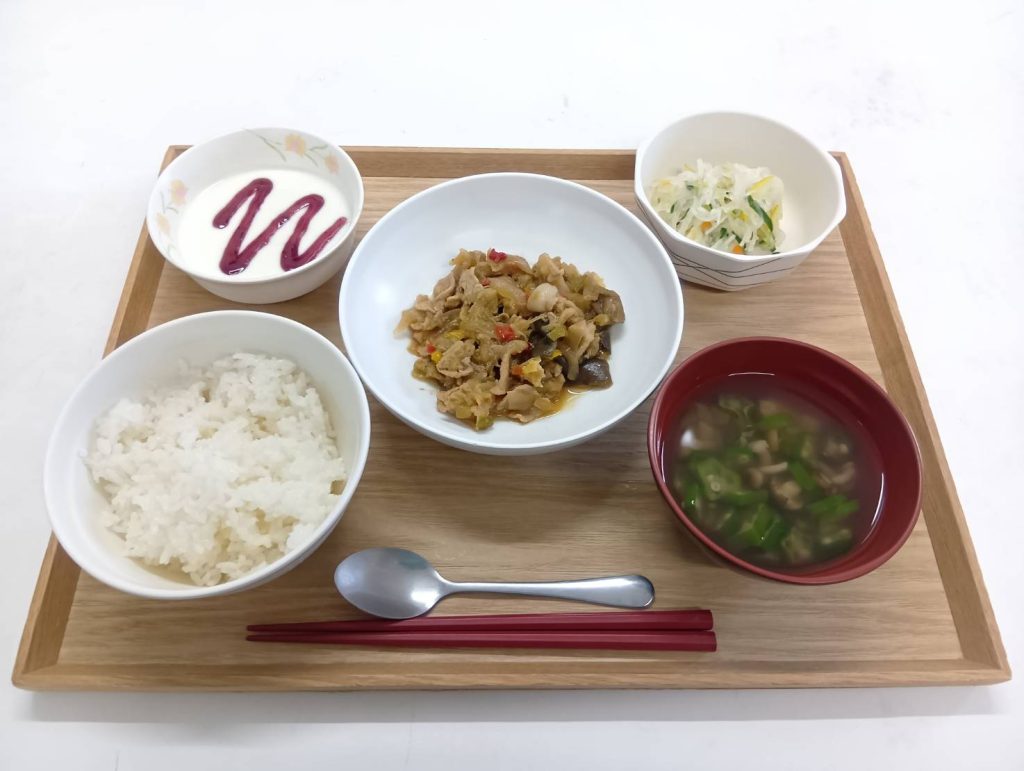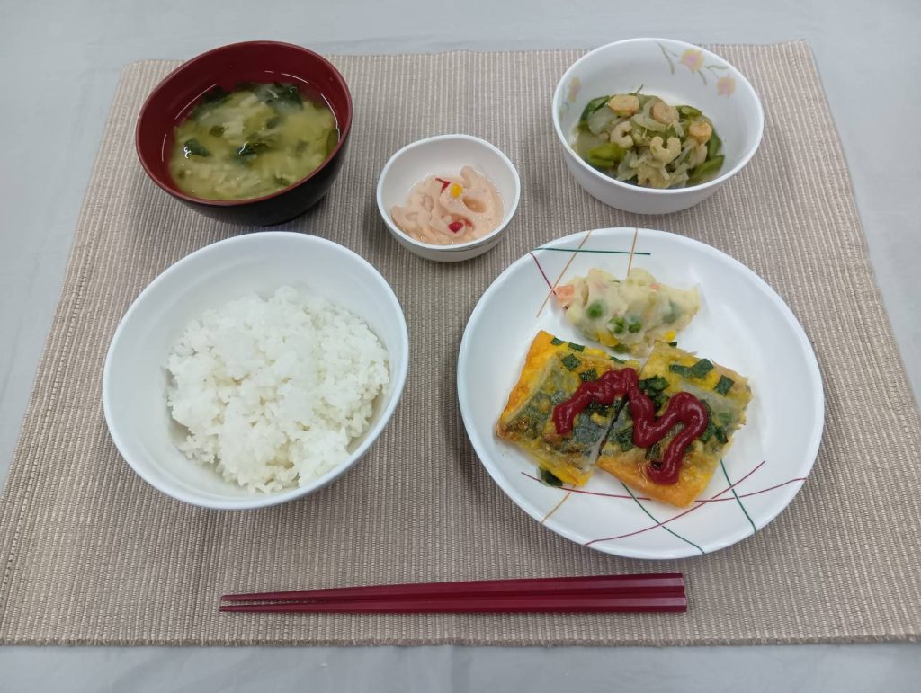 2/16 本日のメニュー 2026年2月18日(水) 朝食 ごはん ひじきの煮物 みそ汁 ふりかけ 牛乳 昼食 ごはん スタミナ豚炒め 五色なます ヨーグルト すまし汁 夕食 ごはん 魚のにら玉焼き もやしソテー れんこんマリネ みそ汁 ← トップページに戻る