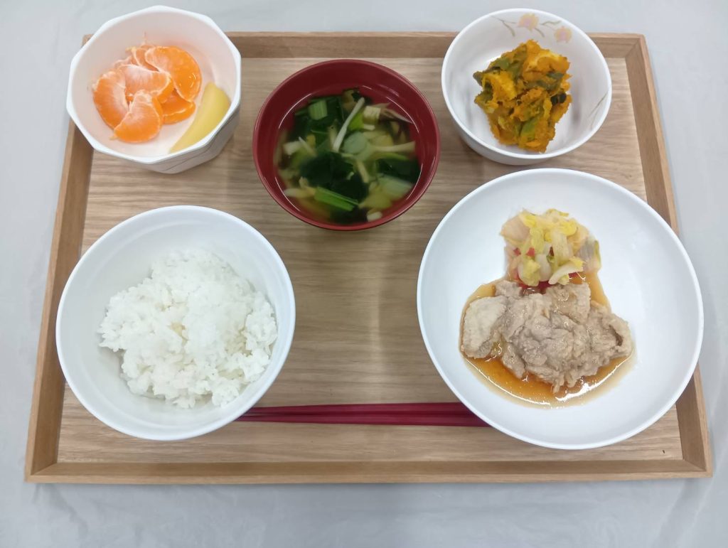 2/17 本日のメニュー 2026年2月19日(木) 朝食 ごはん さつまいもの昆布煮 みそ汁 金山寺みそ 牛乳 昼食 ごはん 魚のわかめ蒸し カリフラワーサラダ やさい豆 みそ汁 夕食 ごはん 鶏の甘酢焼き かぼちゃといんげんのごま和え みかんと白桃の盛り合わせ 中華スープ ← トップページに戻る