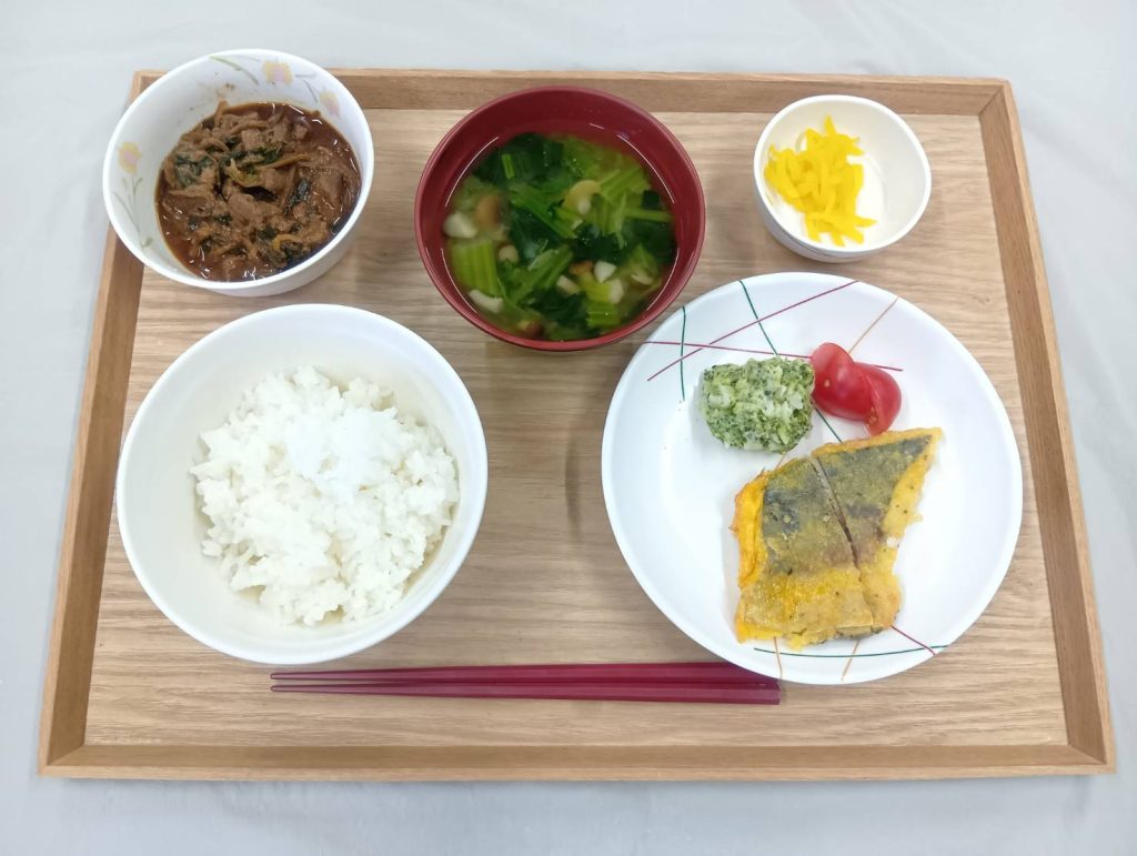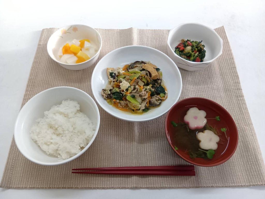 2/21 本日のメニュー 2026年2月24日(火) 朝食 ごはん かぶのとろとろ煮 みそ汁 ふりかけ 牛乳 昼食 ごはん 魚の香草風味ピカタ レバニラ お漬物 みそ汁 夕食 ごはん 豚肉と厚揚げの味噌煮込み 菜の花とホタテのからし和え 杏仁フルーツ とろろ汁 ← トップページに戻る
