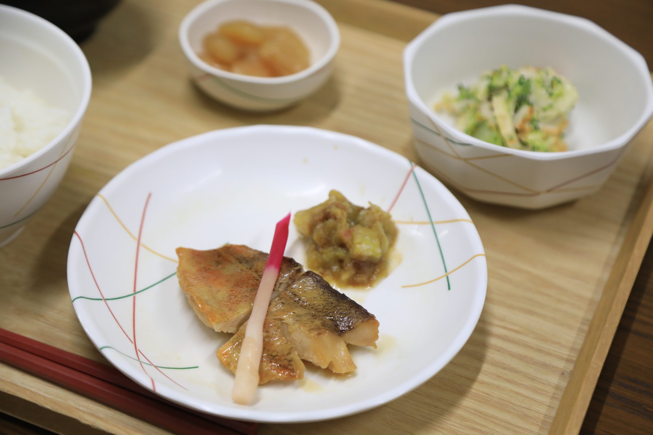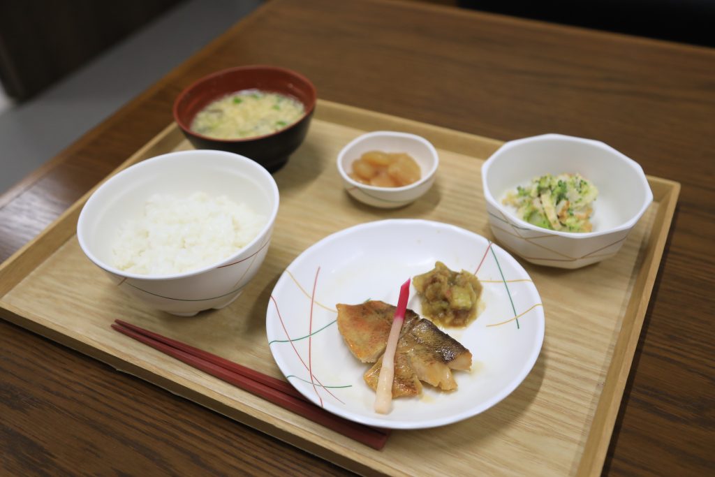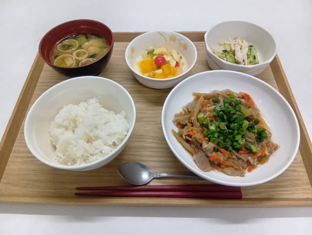 2/27 本日のメニュー 2026年3月2日(月) 朝食 ごはん 小松菜のチャンプルー みそ汁 のり佃煮 牛乳 昼食 ごはん 魚の幽庵焼き ブロッコリーと竹輪のわさマヨ和え 白花豆 かきたま汁 夕食 ごはん 牛肉のしぐれ煮 白菜の酢の物 フルーツポンチ 赤だし汁 ← トップページに戻る