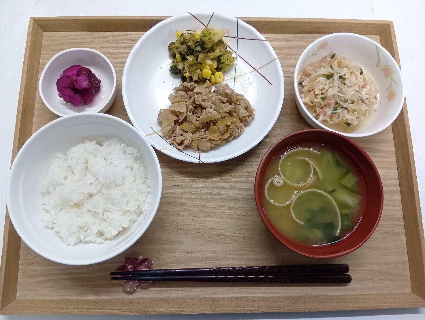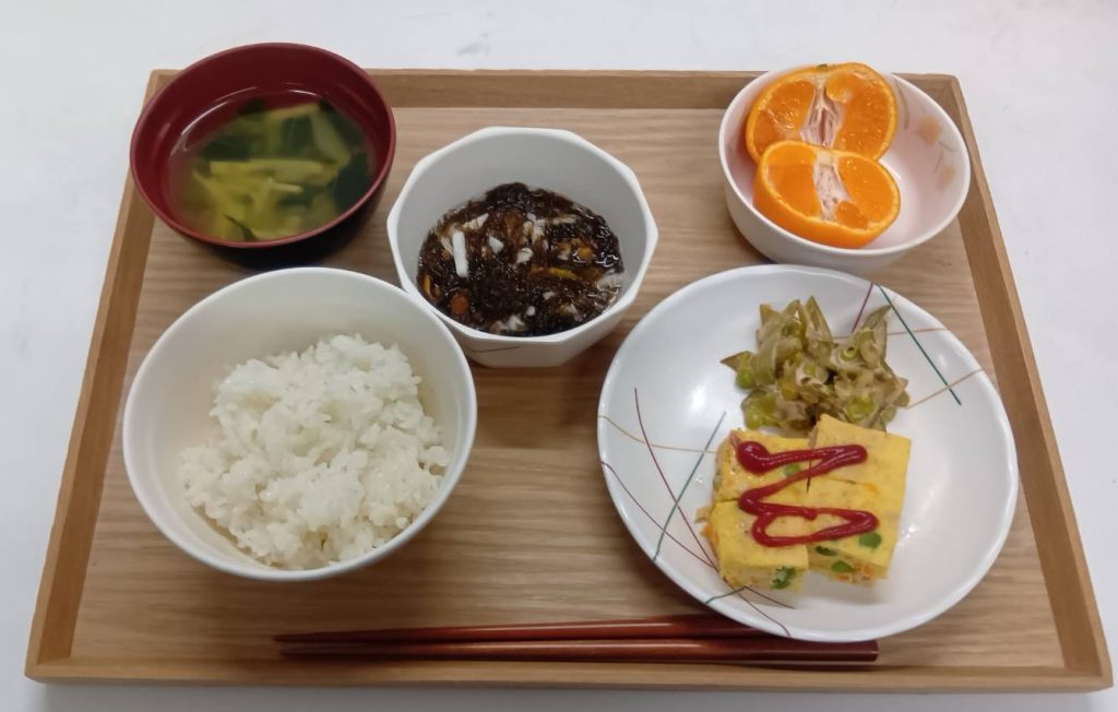 2/7 本日のメニュー 2026年2月9日(月) 朝食 ごはん ピーマンとソーセージのソテー みそ汁 たいみそ 牛乳 昼食 ごはん 豚肉と玉ねぎの香味炒め カニカマの和え物 お漬物 みそ汁 夕食 ごはん ツナ玉 もずくとなめこの酢の物 みかん 中華スープ ← トップページに戻る