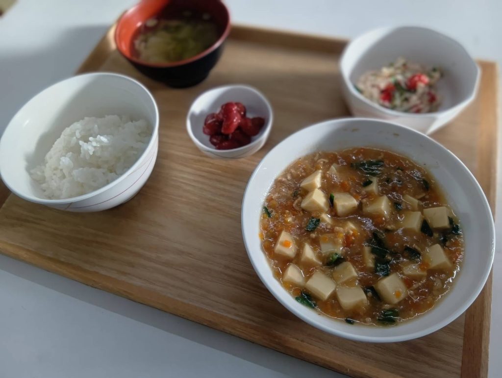 2/8 本日のメニュー 2026年2月9日(月) 朝食 あんぱん なすのガーリック炒め ジュリエンヌスープ 牛乳 昼食 ごはん 魚のみりん焼き おくらの煮びたし 杏仁フルーツ みそ汁 夕食 ごはん 麻婆豆腐 もやしのナムル 金時豆 あさりスープ ← トップページに戻る