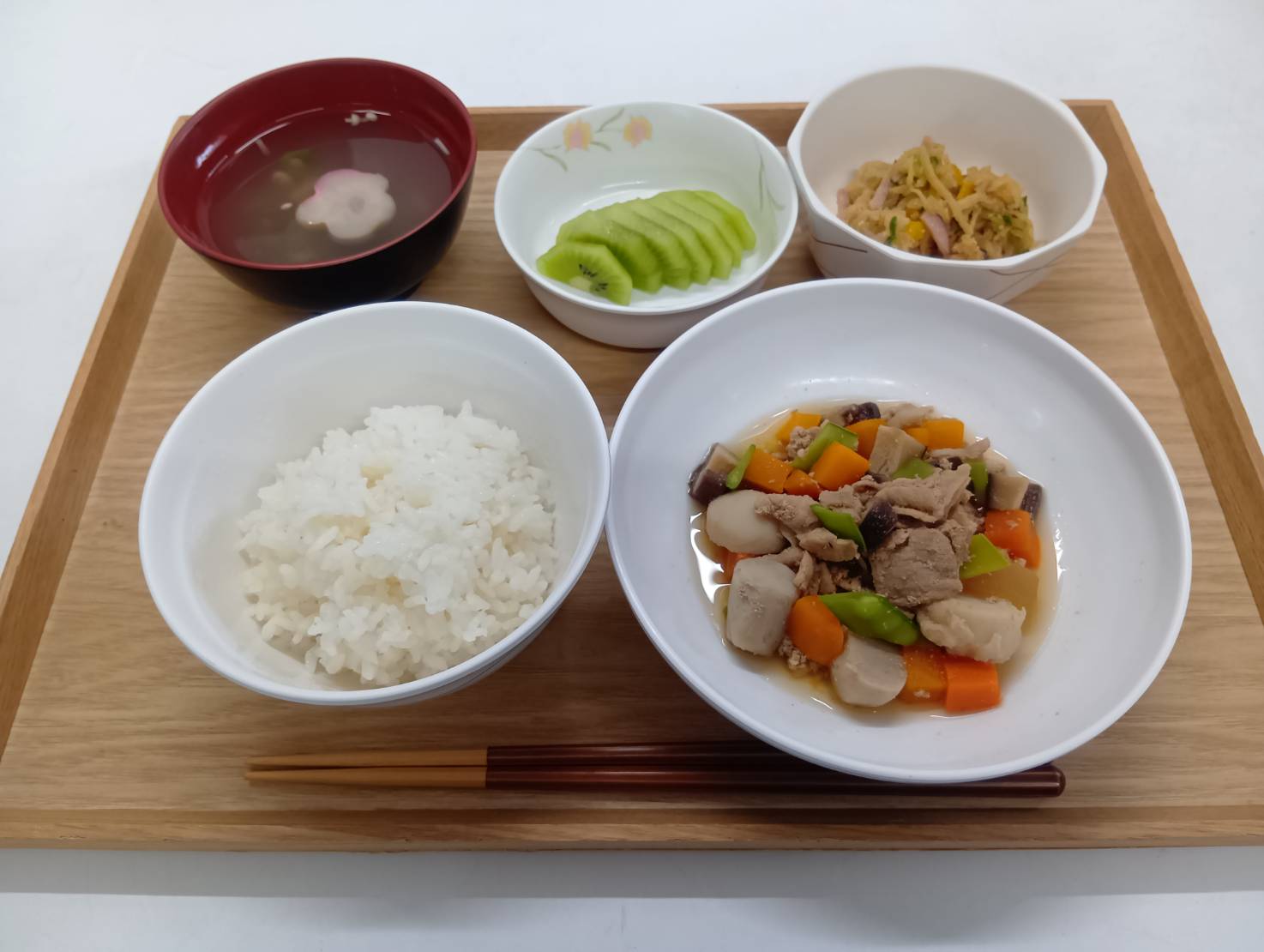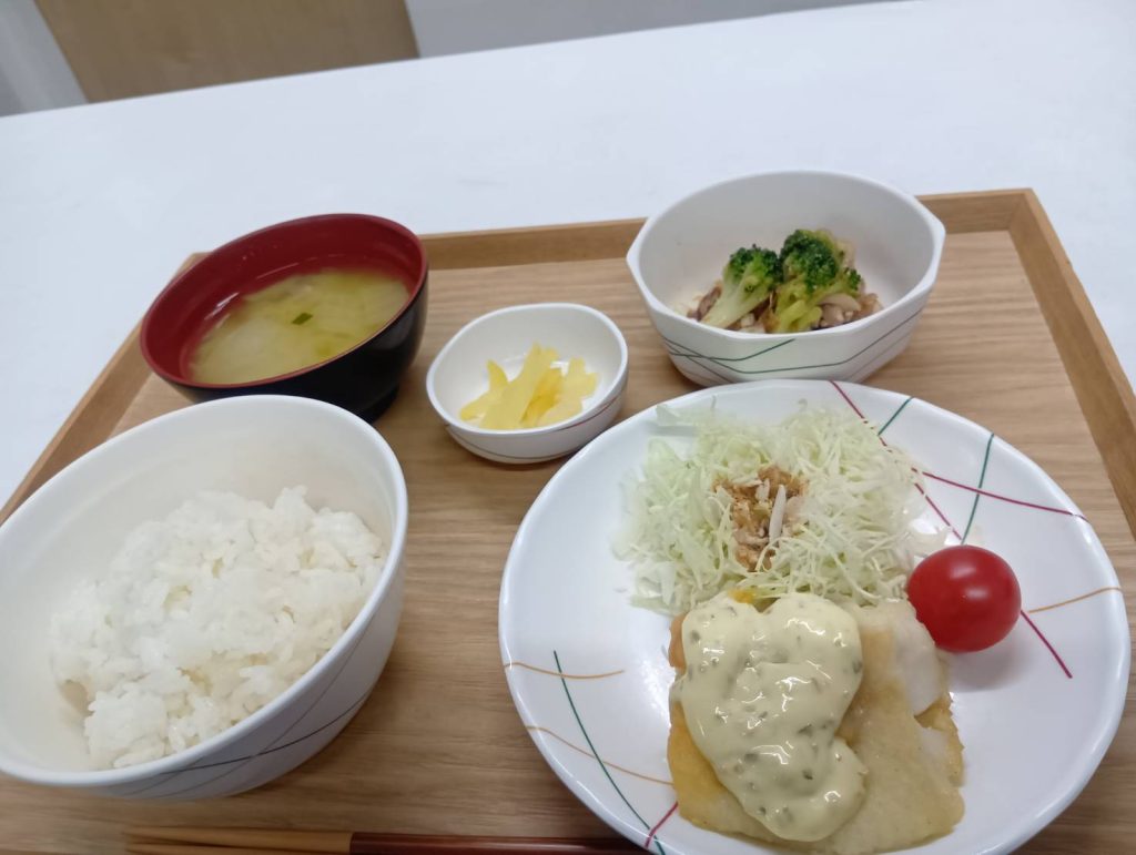 9/24 本日のメニュー 2025年9月26日(金) 朝食 あんぱん 目玉焼き コンソメスープ 牛乳 昼食 ごはん 豚肉と里芋の香り煮 切干大根のピリ辛ナムル キウイ すまし汁 夕食 ごはん かれいのムニエルタルタルソース ブロッコリーのチーズおかか和え お漬物 みそ汁 ← トップページに戻る